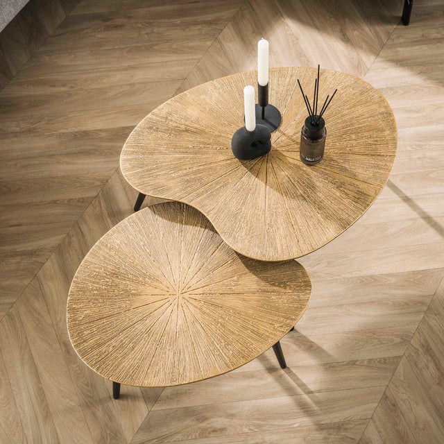 De organische lijnen zorgen voor dynamiek zonder druk te ogen, terwijl de antiek gouden finish warmte en luxe toevoegt aan de zithoek. Dankzij het lage gewicht verplaats je de tafels eenvoudig, ideaal om je zithoek steeds opnieuw te stylen. Combineer met zachte stoffen en natuurlijke materialen voor een gebalanceerde look.