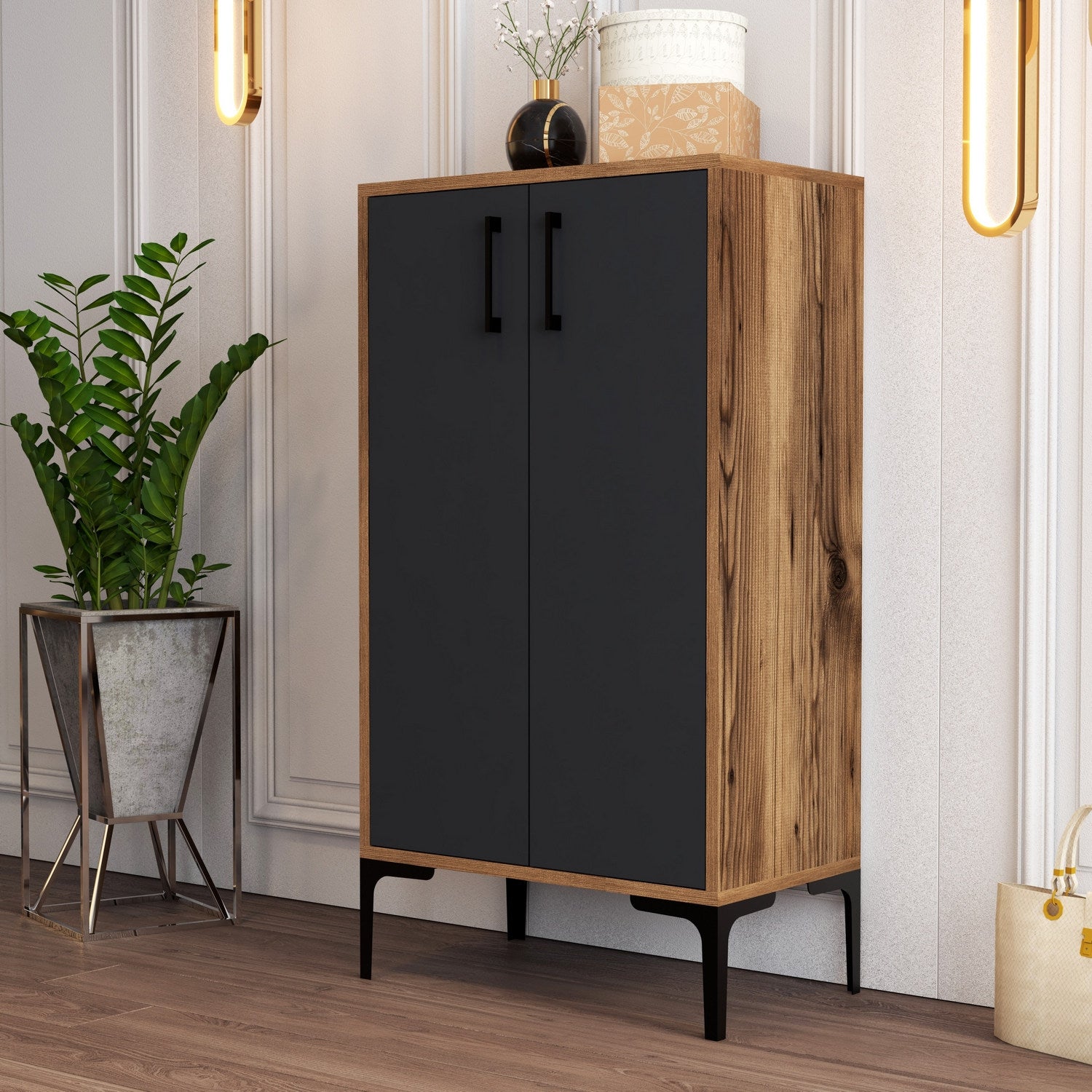 Onze schoenenkast is ontworpen met een strak en modern concept in gedachten. De combinatie van walnoot en antraciet geeft het een geraffineerde en industriële look, waardoor het de perfecte aanvulling is op elk hedendaags interieur.