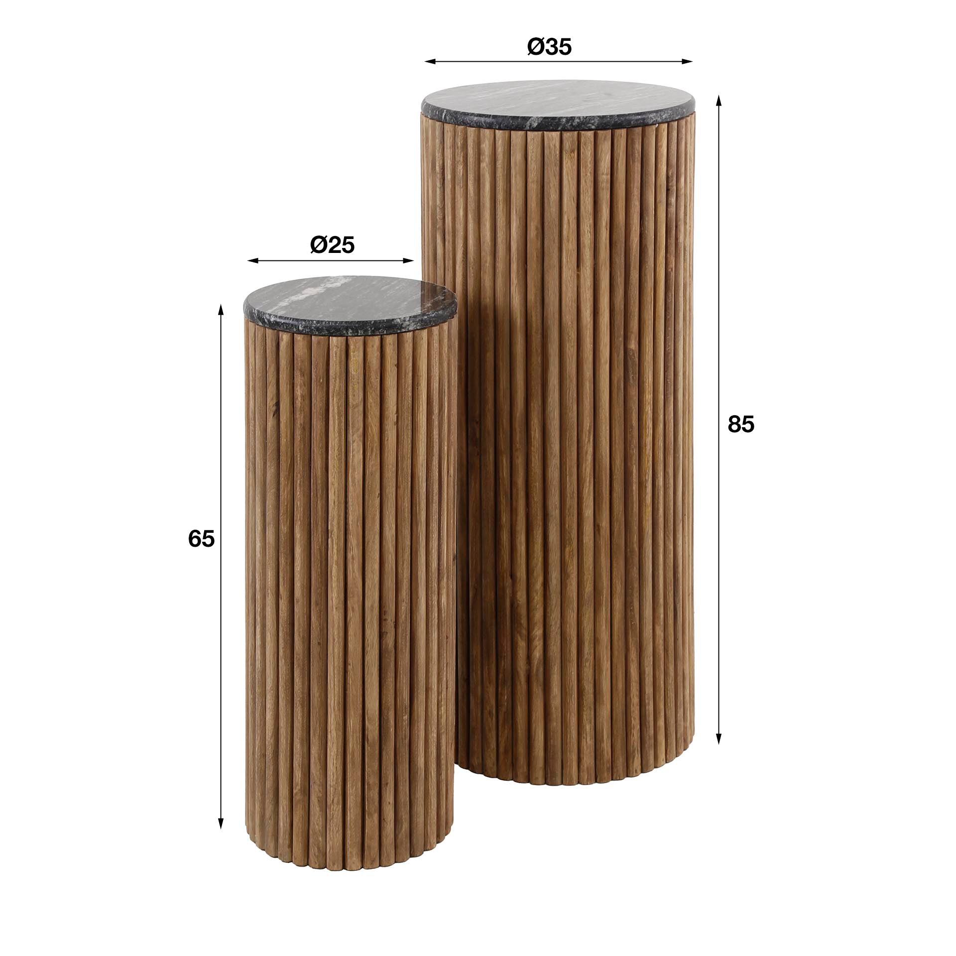 Het blad van elke zuil is vervaardigd uit hoogwaardig zwart marmer, dat een tijdloze en luxe sfeer uitstraalt. Het frame, gemaakt van sterk mangohout, is ontworpen met een golfontwerp dat een eigentijdse en dynamische touch aan de zuilen geeft. Deze combinatie maakt de set een echte eye-catcher in elke ruimte.