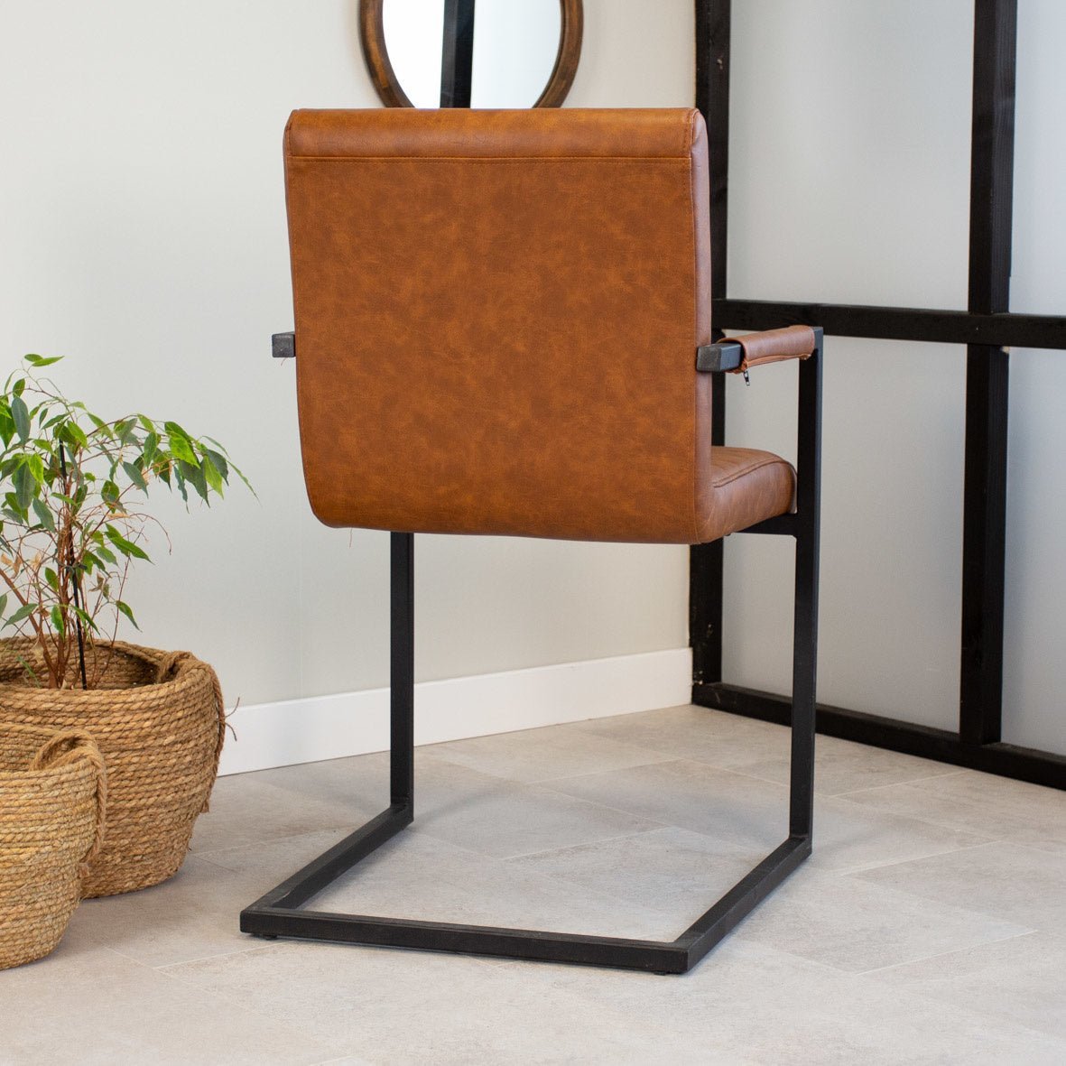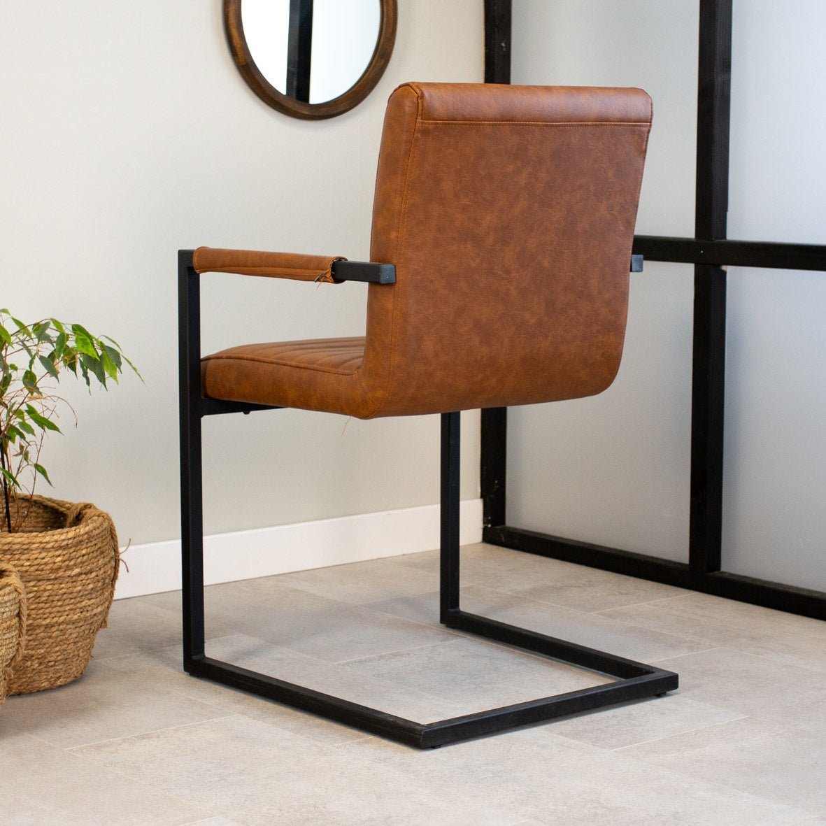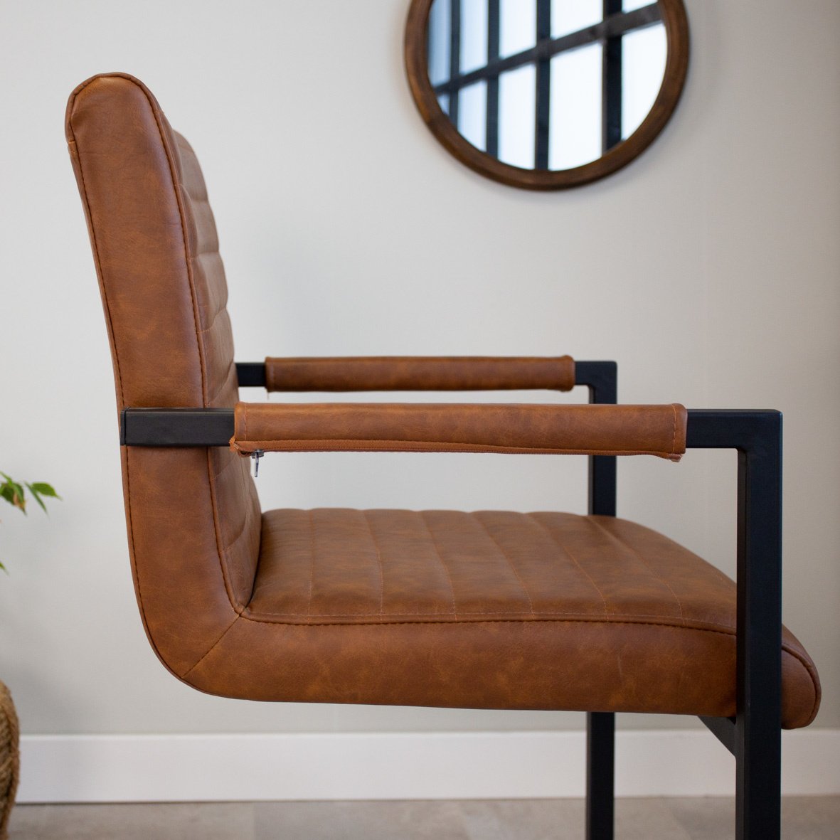 De industriële eetkamerstoel Kuba cognac is de perfecte toevoeging aan een stoer interieur. Met zijn stoere zitting met horizontale naden en zwart gepoedercoat frame de ideale musthave in je interieur!