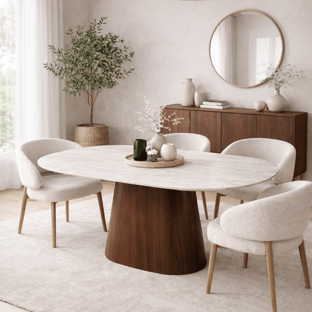 Deze prachtige Deens ovale eettafel combineert een licht blad van sintered stone met marmerlook en subtiele travertine details. De zachte nerfstructuur geeft het blad een luxe, chique uitstraling, terwijl het warme onderstel met walnoot look zorgt voor harmonie.