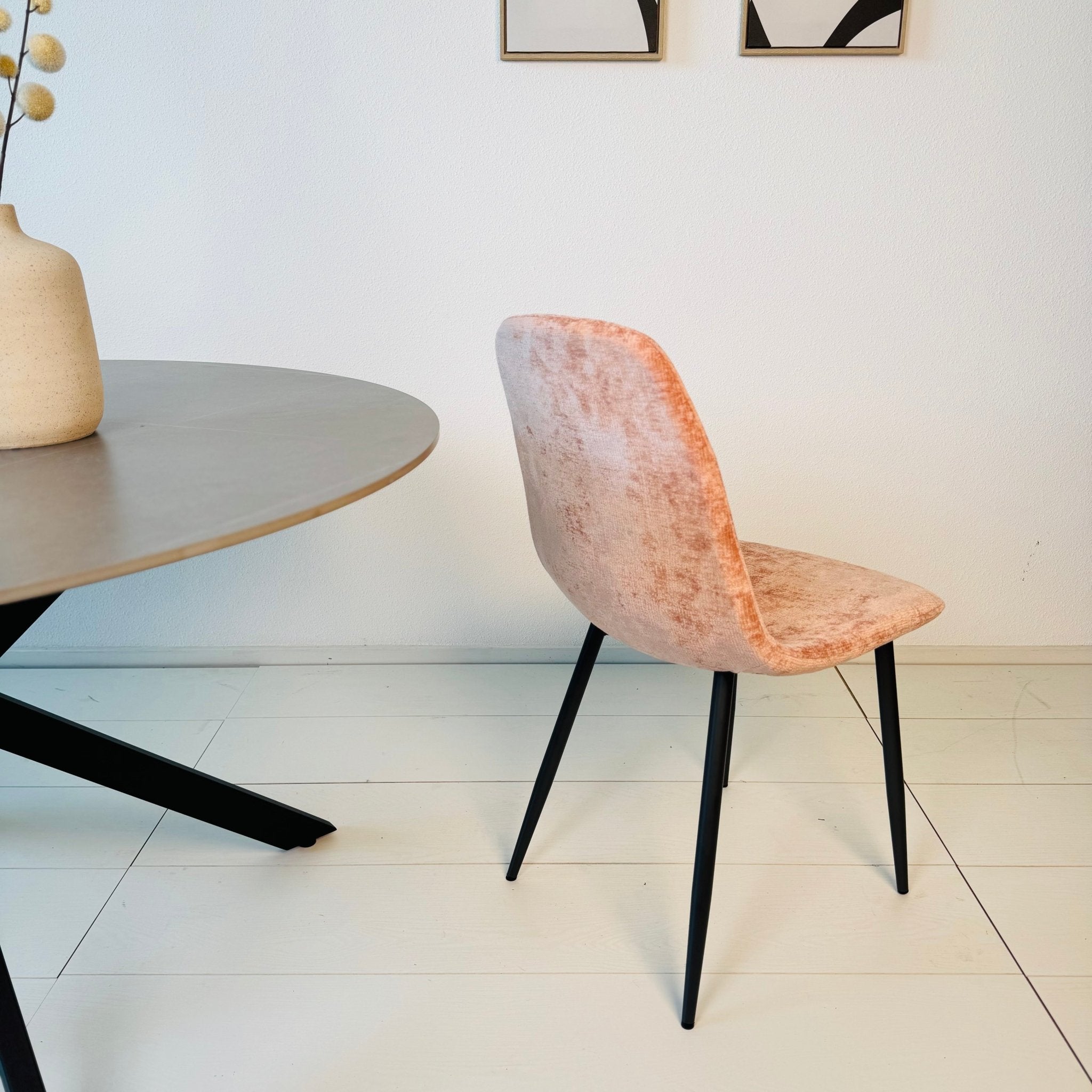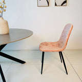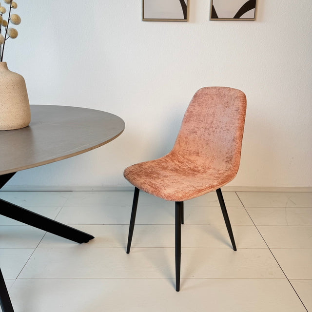 Breng stijl en comfort naar je eetkamer met de Scandinavische eetkamerstoelen Swift. Deze set van 4 kuipstoelen in een warme oud roze chenille stof geeft jouw interieur een zachte, moderne uitstraling. Het elegante ontwerp zonder armleuningen en het zwarte metalen onderstel zorgen voor een minimalistische, luchtige look – perfect voor elk eigentijds interieur.
