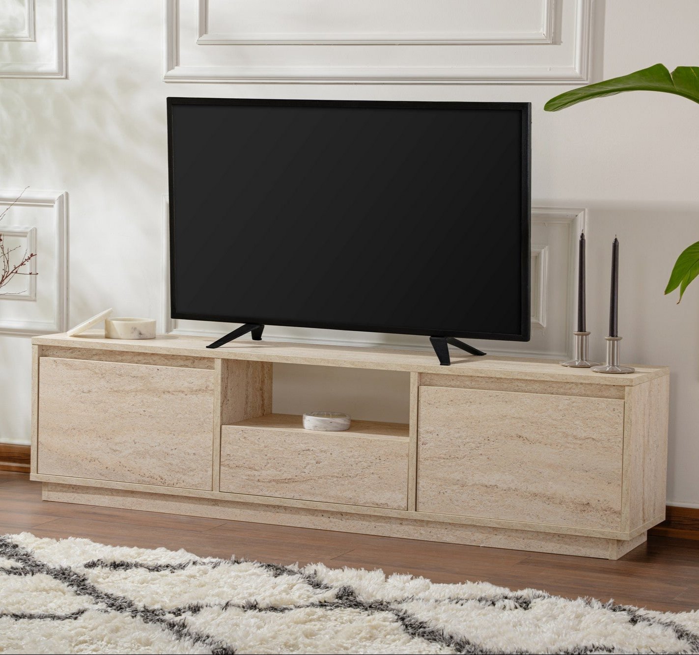 Zeg vaarwel tegen rommel en hallo tegen een strak en modern tv-meubel dat de look van je woonkamer onmiddellijk zal verbeteren. De travertin kleur voegt een vleugje luxe toe, waardoor het de perfecte aanvulling is op elke woonstijl.