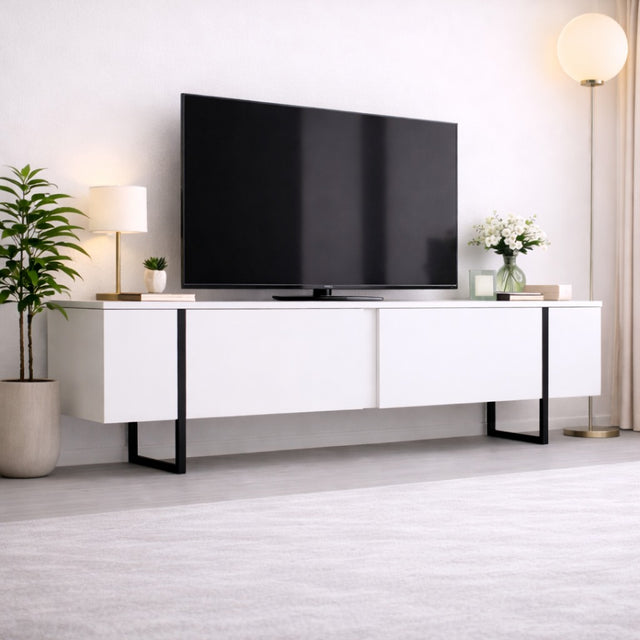 De tv-standaard heeft een opvallende combinatie van witte en zwarte kleuren en voegt een eigentijdse flair toe aan je woonkamer. Het strakke en minimalistische ontwerp past moeiteloos bij elke interieurstijl, waardoor het een veelzijdige aanvulling is op je interieur.