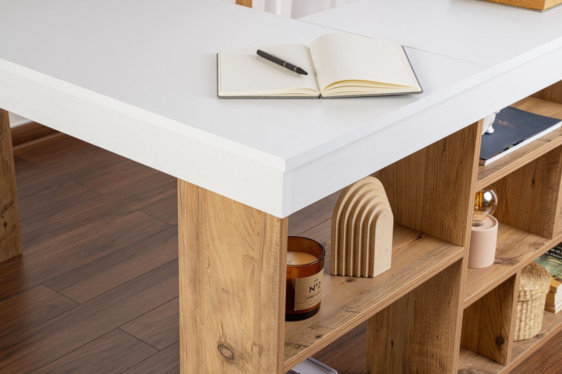 Met een ruim werkoppervlak van 130 cm lang, 120 cm breed en 72 cm hoog biedt dit bureau plek voor laptop, boeken en notities. De combinatie van wit en Atlantisch dennenhout geeft een frisse, moderne uitstraling die elke kamer verfrist en studeren aangenamer maakt. Het ontwerp sluit aan bij verschillende stijl.